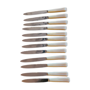 12 Couteaux lames inox bouts ronds / manches Bakélite effet nacré / Prulhière La Béquille + Coffret / Années 50