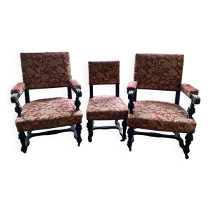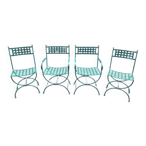 3 chaises et 2 fauteuils en fer forgé et rotin canné, années 50