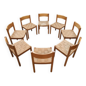 8 chaises en chêne rustique alliant lignes modernes et artisanat breton par un élève de Joseph Savina 1950’s