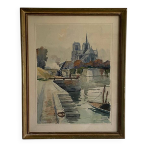 Aquarelle sur papier bateau ancré près d'un pont XIXe cadre doré