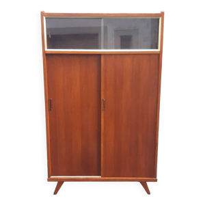 Armoire vintage pieds compas en bois brut portes coulissantes 1960
