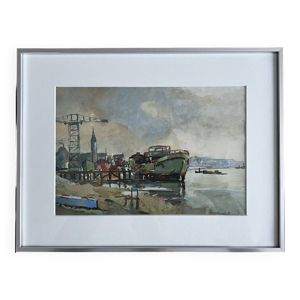 Bateaux au petit port, signé F. Lombard