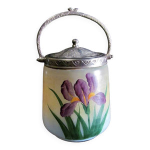 Bonbonnière vintage beige faïence - Décor fleuri bleu peint à la main