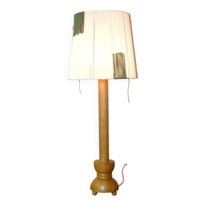 Bougeoir en bois monté en lampe et son abat-jour en corde, 47.5cm.