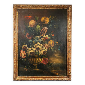 Bouquet fleurs sur table huile sur panneau isorel signe M. Cornil