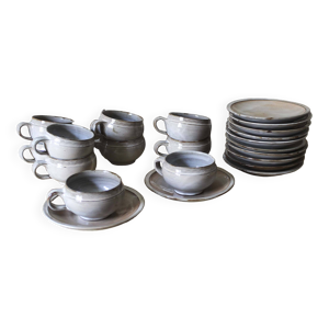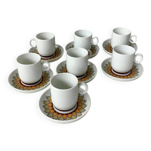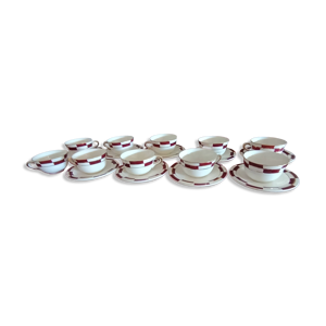 Deux tasses à café vintage en acier inoxydable de style mid-century moderne avec soucoupe.