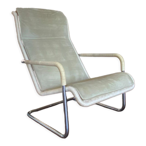 Fauteuil pliant tube métal noir avec tissu rouge années 70 vintage