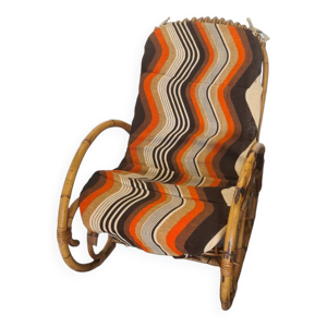 Fauteuil vintage, coussins à carreaux neufs, état d'origine du bois des années 1970
