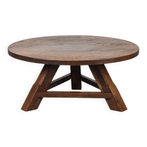 Grande table basse ronde tripode en bois de style brutaliste, années 1960