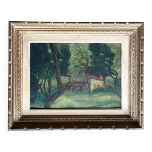 Huile sur bois encadrée et signée Henri Merlet, barque couchée sur Grève