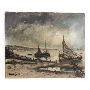Huile sur toile marine signée G.S. Warth – Village côtier et voiliers