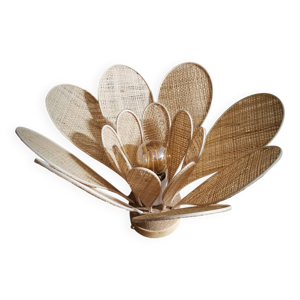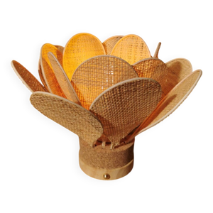 Lampe à poser fleur composée de pétales en rotin et maille dorée