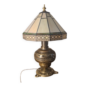 Lampe bronze ancien pied feuille et pate de verre vitrail art nouveau