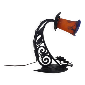 Lampe fer forgé noir avec patine or avec tulipe moulé 1920