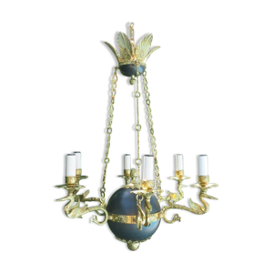 Lucien Gau French Empire Bronze Chandelier: Swan Arms, Green Tole
