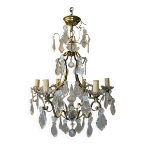 Lustre ancien à pampilles en verre et bronze doré – 6 bras – style Louis XV