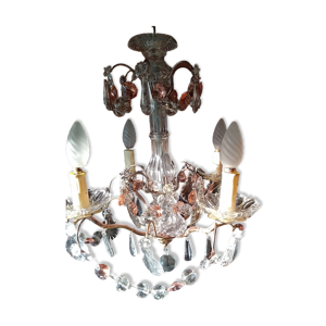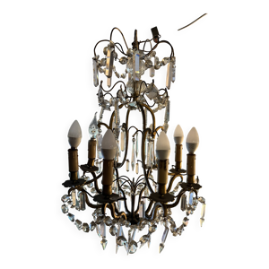 Lustre cage en bronze doré garni de pampilles en verre en forme de plumes de paon vers 1800