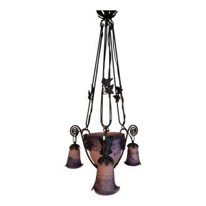 Lustre en pâte de verre 1 coupe et 3 tulipes signé '' Degué