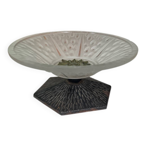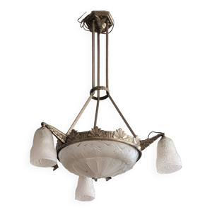 Lustre signé Muller Frères Lunéville , suspension Art déco, lustre bronze nickelé, lampe de plafond,
