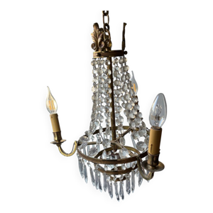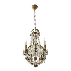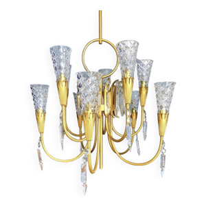 Lustre vintage en cristal à la feuille d'or avec 6 lumières, années 1950.