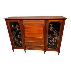 Meuble d’appui en marqueterie de bois précieux, richement décoré d’une marqueterie florale