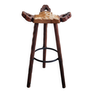 Paire de chaises espagnoles des années 1950 en bois massif sculpté avec assises en cuir de vachette beige