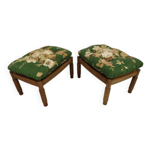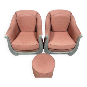 Paire de chaises et pouf Radassier en hêtre provençal français, avec assise en jonc.