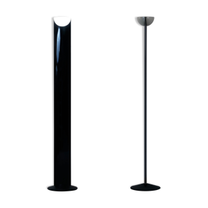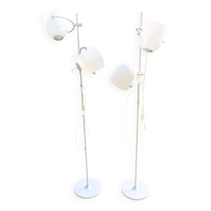 Paire de lampadaires de parquet design composés de bases en métal laqué, chrome et abat-jours design de plastique blancs