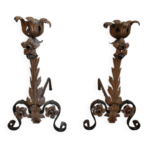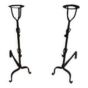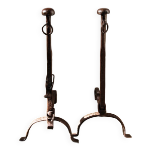 Paire de landiers XVIIIe en fer forgé, chenets porte buches