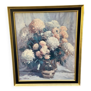 Peinture à l’huile sur bois fleurs signée Grumet
