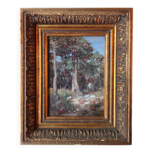 Peinture ancienne bucolique – Pêcheurs et peupliers au bord de l'eau