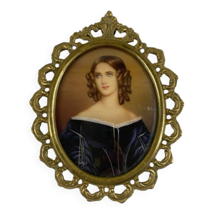 Petite miniature ancienne sur support organique – Cadre bois noirci