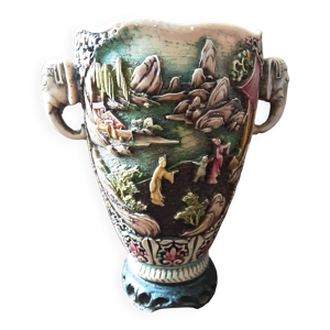 Service à thé asiatique en céramique, mazagrans et théière motif paysage