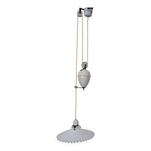 Suspension ancienne avec contre-poids, abat-jour en métal et porcelaine