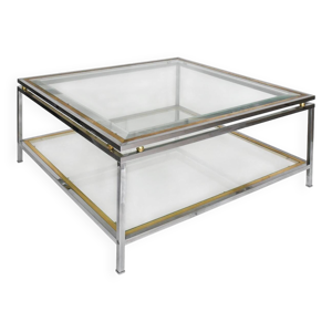 Table basse carrée des années 70 en travertin et laiton