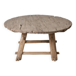 Table basse ronde en orme massif et tomettes - tripode - design 1970