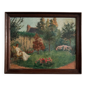 Tableau ''Dans le Parc'' paysage animé impressionniste J. Toussaint 1883