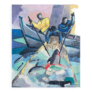 Tableau HST ''Paysage aux vilage et pêcheurs'' signé Texier + cadre XIX°