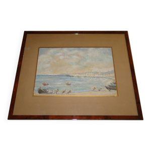 Tableau marine pêcheurs au clair de lune signé + cadre