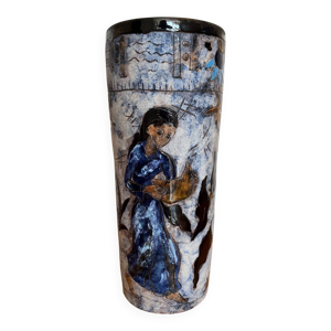 Vase rouleau céramique motifs géométriques stylisés - Signé - Années 1960/1970