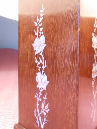 Large fût droit, de section carrée, en bois de "Sunuke", orné sur chaque face d'une longue branche de cerisier en fleurs en marqueterie de nacre regravée.