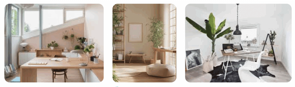 Les teintes neutres et naturelles – beige, blanc cassé, gris doux, vert sauge – créent une atmosphère propice au calme et à la réflexion. Le bois clair apporte chaleur et sérénité, tandis que les matériaux naturels comme le lin, le coton ou le bambou renforcent cette connexion apaisante avec la nature.