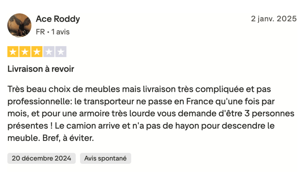 - Livraison = point sensible récurrent : délais parfois longs, suivi peu clair, transporteurs variables selon les pays ; ça passe quand tout va bien, ça crispe quand ça dérape.