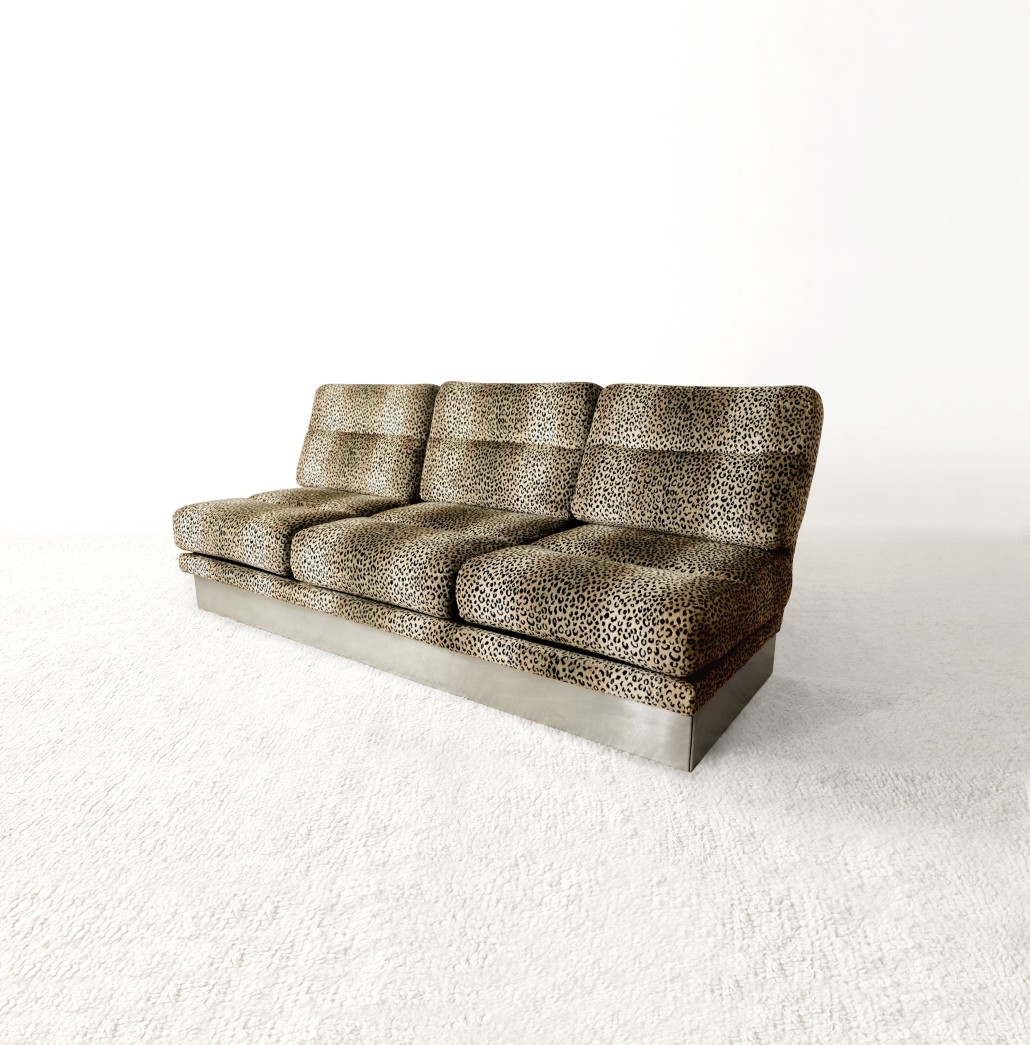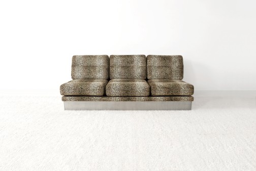Très jolie détail de la base en inox qui contraste avec le confort des coussins. Son assise très confortable donnera une véritable ambiance rétro dans votre salon, ou une touche oldschool dans votre chambre. Tapisserie des coussins restaurée en jacquard Velours motif Léopard de l’éditeur Casal. Détail déco idéal dans un intérieur contemporain, mélangé avec d'autres pièces comme des chaises bauman, une table knoll ou un fauteuil bertoïa.
