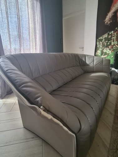 Modèle bi-color, cuir pleine fleur, intérieur gris clair, extérieur blanc. Version déhoussable par bandes agrippantes et fermetures à glissières. Très facile d'entretien.