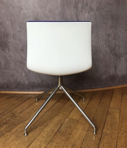 Lot de 4 chaises Catifa 46: - piètement: aliminium brillant - coque: blanche - revêtement: tissu bleu nuit - 2 pièces neuves, 2 pièces tachées