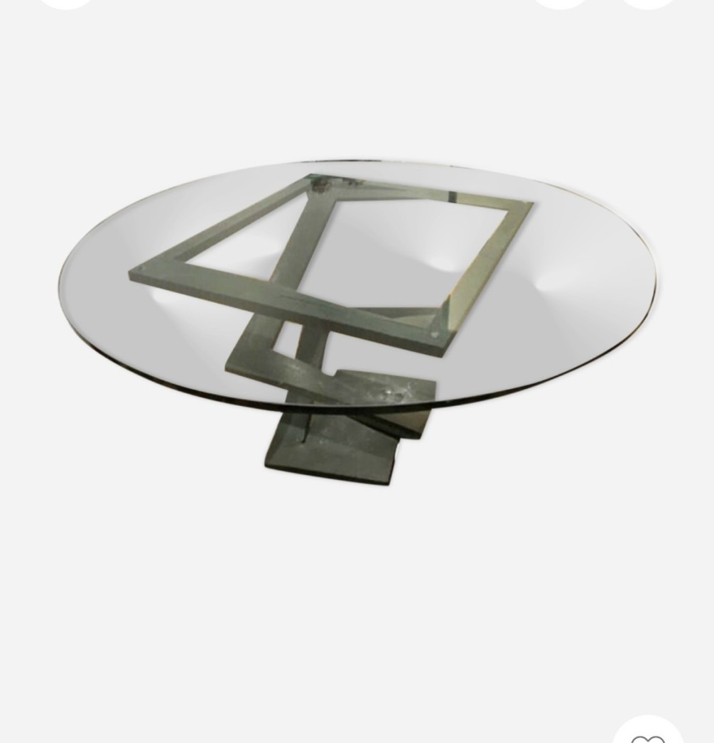 Table avec plateau en verre de 1.50m de diamètre, épaisseur 2cm, pied carré en fonte couleur vert.