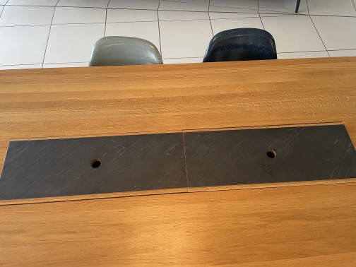 Plateau amovible au centre : un côté en ardoise, un côté bois, avec 2 bacs de rangement dessous